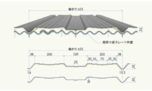 | 今のスレート大波屋根をそのままに上からのカバー工法屋根材です。 通常の業務を行いながら、廃棄物もだすことなく短工期での施工が 可能なリフォーム屋根材です。 |